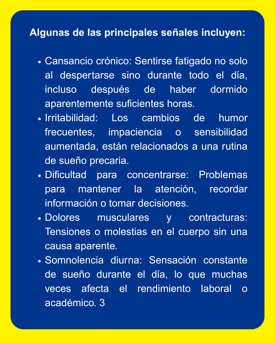 Señales de alerta de un sueño deficiente Desde hace mucho escuchamos el mandato de que “hay que dormir 8 horas” para obtener el descanso necesario. Pero no siempre dormir 8 horas es sinónimo de una buena calidad del sueño. 2 De esas ocho horas, ¿cuántas corresponden a sueño ligero y cuántas a sueño profundo? Durante las 8 horas, cuántas veces nos despertamos? ¿Cuánto tiempo nos llevó conciliar el sueño? Son más factores que entran en juego a la hora de calificar la calidad de nuestro descanso. Identificar los síntomas de alerta es esencial para tomar medidas correctiva.